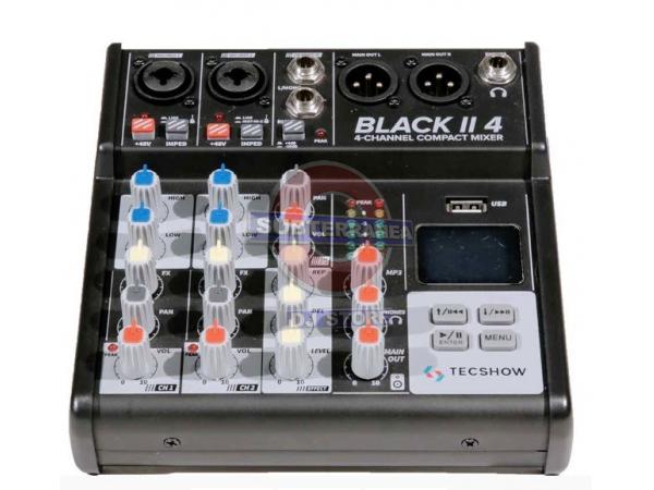 Consola Mixer Tecshow Black Ii 4 Usb Bluetooh Efectos!!! Mezcladora analogica confiable - 2 entradas Mic/Linea, 1 estereo Black II 4 es la segunda generacion de mezcladores Black, ahora con mayor portabilidad y versatilidad. Cuenta con 2 entradas de microfono con alimentacion phantom conmutable de 48V y 2 entradas de linea, una estereo y una mono. Ofrece conexion bluetooth como asà también un puerto USB que sirve tanto para grabar la señal de salida como para reproducir archivos de audio. Esta renovada serie de mezcladores permite también un manejo preciso y prolijo gracias a sus controles de volumen independiente, pantalla LCD de control y los indicadores LED disponibles para cada canal. Black II 4 es la opción Ideal para aquellas personas que desean grabar actuaciones, podcasts, obras, conferencias o ensayos brindándole al usuario la posibilidad de trabajar en archivos MP3, WMA, APE y FLAC.